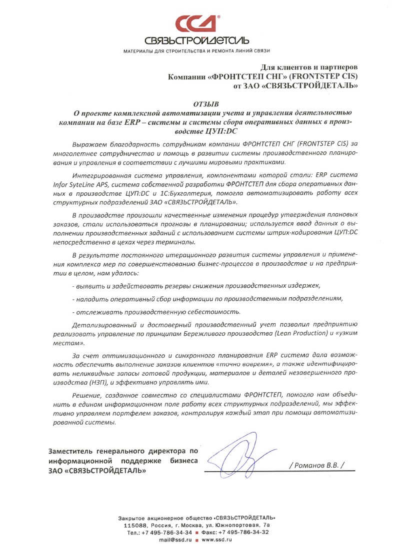 Генеральный директор ФРОНТСТЕП СНГ (FRONTSTEP CIS) Мусин Владимир Рашитович: «Компания СВЯЗЬСТРОЙДЕТАЛЬ является для нас Партнером с большой буквы – мы тесно взаимодействуем с сотрудниками, и взаимно обогащаемся знаниями и идеями. Считаю уровень компетенций ИТ, инженерных и управленческих кадров высочайшим, подтверждением тому служит постоянный интерес коллег из других отраслей к достижениям компании, управленческие технологии предприятия неизменно получают их высокую оценку.